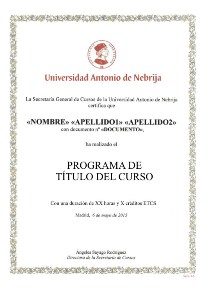 Tras aprobar la evaluación del curso (preguntas tipo test y de desarrollo) se le enviará su título acreditado por la Universidad Antonio de Nebrija, con 300 horas baremables y 12 créitos ECTS